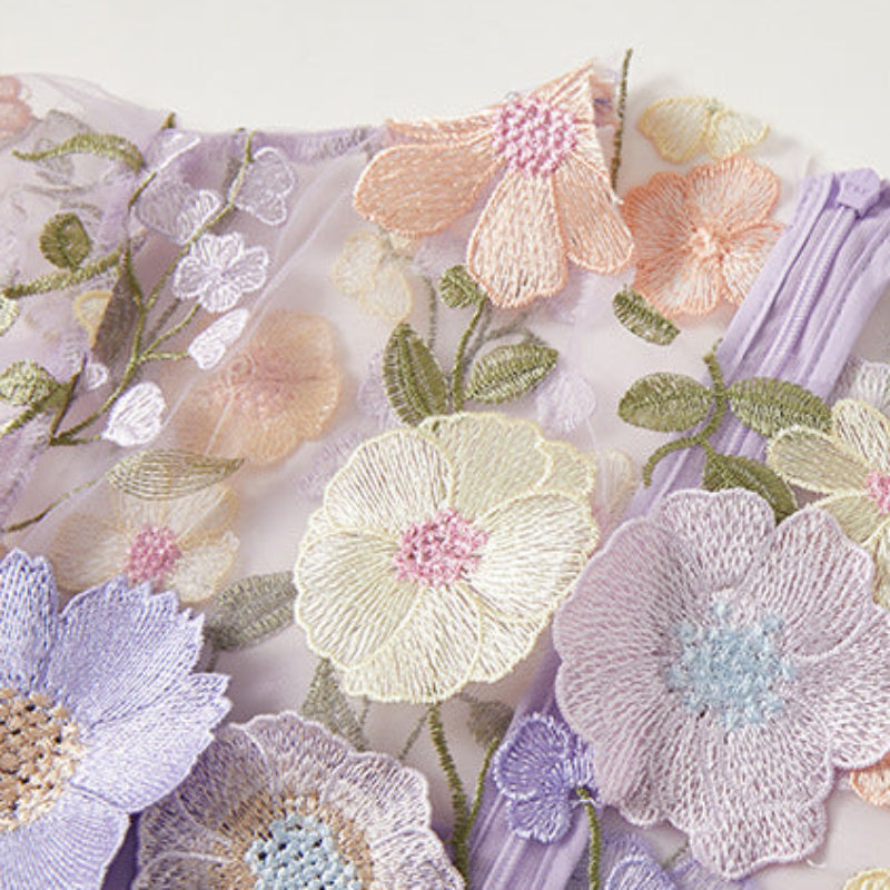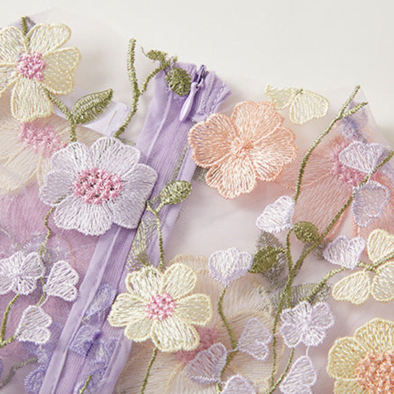 An ode to beauty, woven in petals and color—this maxi dress blooms with artistic detail from neckline to hem. The embroidered florals dance across the sheer layer, creating a luminous dimension that feels both ethereal and powerful. Made for days you want to feel unforgettable, it elevates presence into something almost dreamlike.